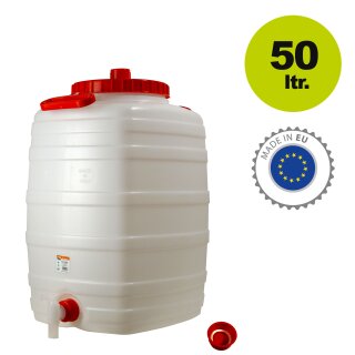 (330GB50) Kunststofffass mit Schraubdeckel, rechteckig: Fischer Mostfass / Getränkefass / Gärfass 50 Liter, ungefärbtes lebensmittel-echtes PE Fass, inkl. Auslaufhahn, 2 Blindstopfen und 2-teiligem Schraub-Deckel, mit Gärspundloch, made in EU