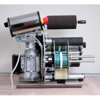 Manuelle Tischetikettiermaschine für selbstklebende  Etiketten, ausgestattet  mit einer einzelnen Anpressrolle für die Anbringung des Vorderetikettes (oder alternativ Vorder- und Rücketikett auf derselben Spule) auf zylindrischen Behälter.