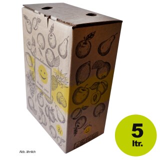 (520K5BH) (ab 0,86 EUR - STAFFELPREISE BEACHTEN!) Bag in Box natur-braun, 5 Liter, Auslauf unten Mitte, Kartonmotiv "Happy Juice", Saftkarton leicht beklebbar mit eigenem Label, Karton ohne Beutel