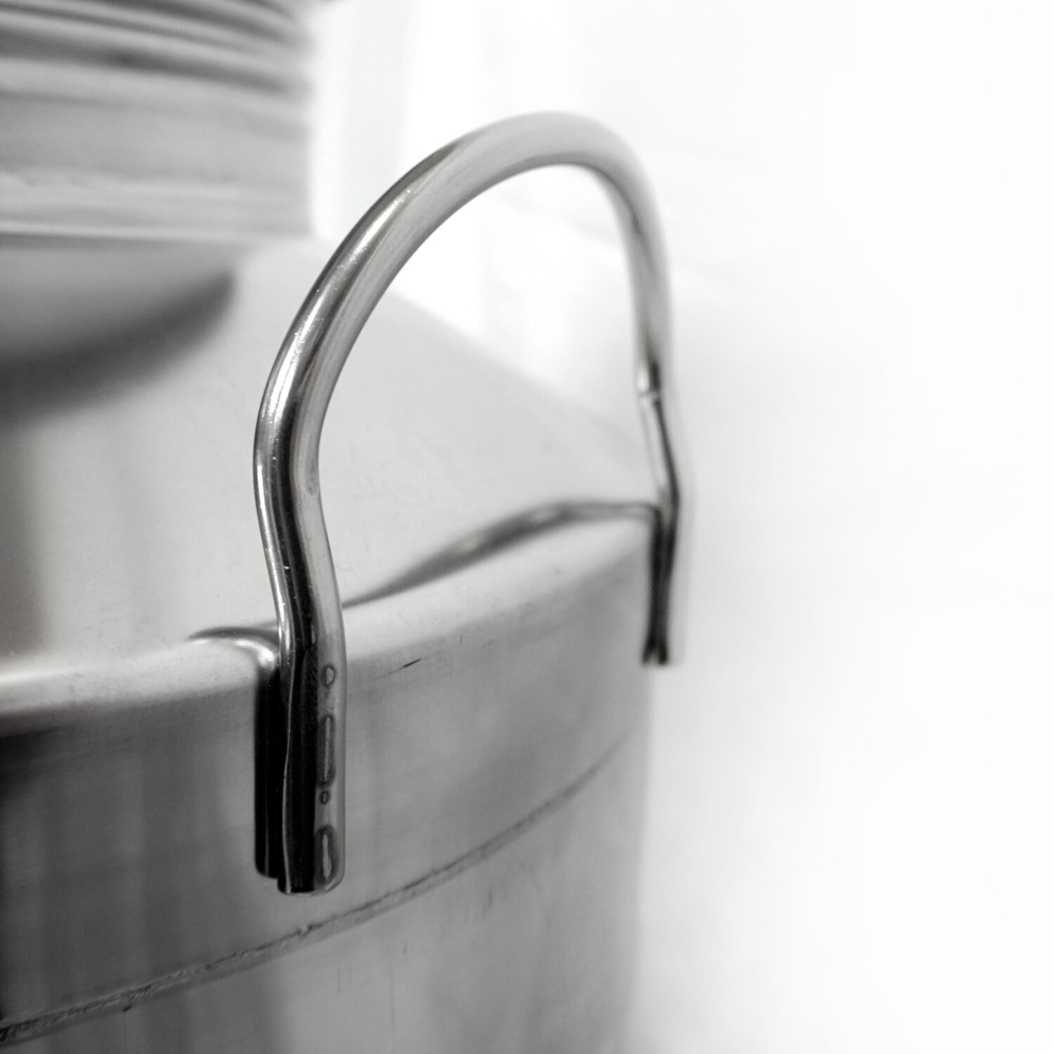 Fischer Kellereitechnik Edelstahl-Kanne 100 Liter Inhalt. Zum Transport von Milch, Säften, Honig, Öl, Edelbrand/Schnaps, Likören, Wein, Essig und vielen anderen Lebensmittel-Flüssigkeiten. Kanne mit 2 Tragegriffen ohne Edelstahlauslaufhahn