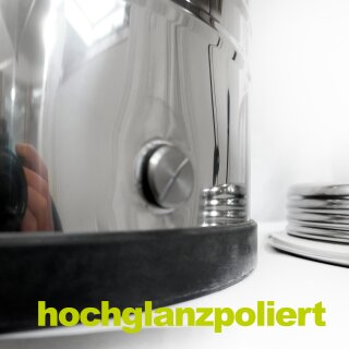 Getränkefass Edelstahl, hochglanz-poliert: Klassisch, funktionell, sehr schön und völlig unverwüstlich. Die erschwingliche, professionelle und die einzig lebensmittel-sichere Alternative zum Kunststoff-Getränkefass!