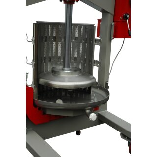 Fahrbare Elektrohydraulische Obst und Beerenpresse in stabiler Ausführung. Presskorb zum einfachen Befüllen auf heraus schwenkbarer Saftwanne.