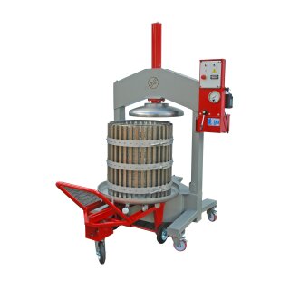 Elektrohydraulische Obst und Beerenpressen OPHE 80 mit Holzkorb und Fahrwagen Fahrbare Elektrohydraulische Obst und Beerenpresse in stabiler Ausführung. Edelstahlpresskorb zum einfachen Befüllen auf herausziehbarer Presswanne und Fahrwagen. Technische Daten: •Maischepresse Korbgröße: 80 x 90 cm •Korbinhalt: 475 Liter •Pressdruck: 46430 kg •Arbeitsdruck: 350 Bar •Spannung: 380 Volt •Edelstahlpresskorb mit Fahrwagen Jetzt Kelter günstig online oder per Telefon-Bestellung kaufen