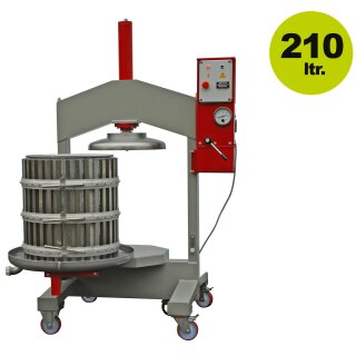 Fahrbare Elektrohydraulische Obst und Beerenpresse 210 Liter Inhalt in stabiler Ausführung. Edelstahlpresskorb zum einfachen Befüllen auf schwenkbarem Pressteller.