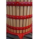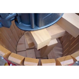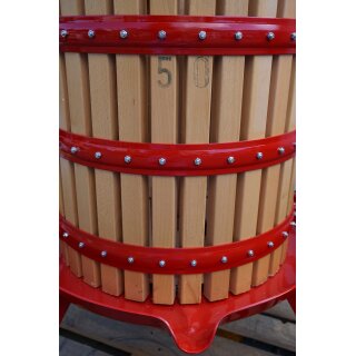 Die Literangabe beschreibt das Korbinhalt. Faustwert: Korb-Liter ≈ kg Obst pro Füllung; davon ≈ 60 % Saft. Beispiel: 40-Liter-Presse ⇒ ca. 40 kg Obst ⇒ ca. 24 Liter Saft. Ein Pressvorgang dauert ca. 10 Minuten. Wähle die Größe nach deiner durchschnittlichen Erntemenge.