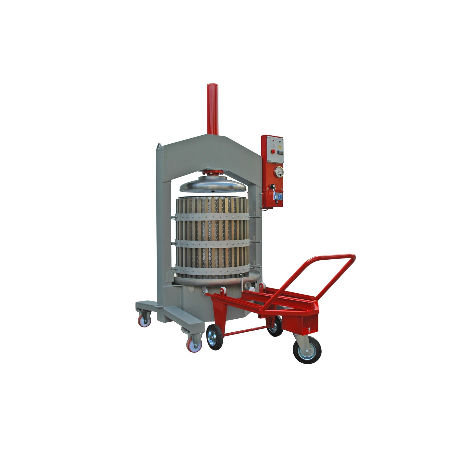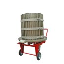 Fahrbare Elektrohydraulische Obst und Beerenpresse in stabiler Ausführung. Presskorb zum einfachen Befüllen auf separatem Transportwagen.
