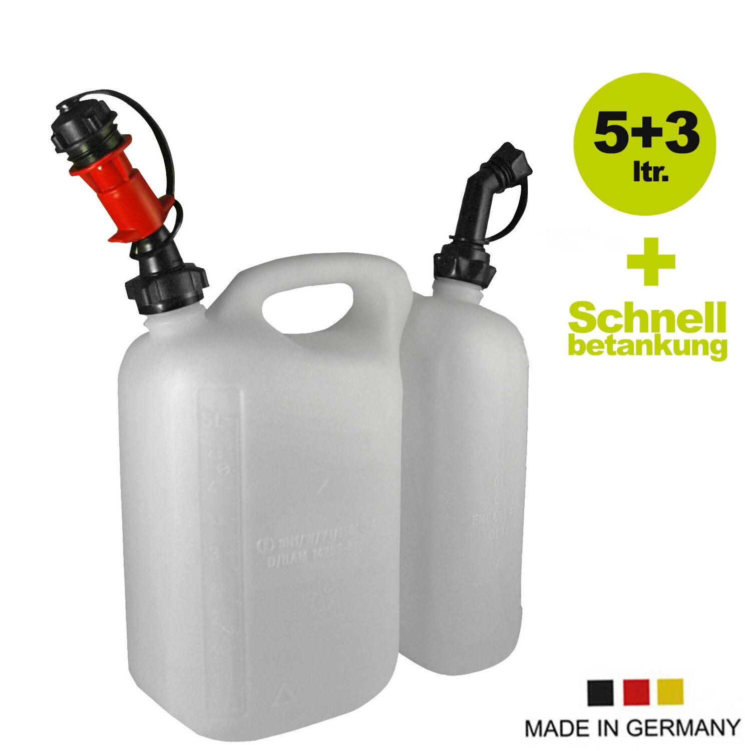 (250FO23610+FuelsysBenzin) Original Hünersdorff Doppel-Kanister / Kombi-Kanister 5+3 Liter + 1 autom. Füllsystem für Benzin, Made in Germany