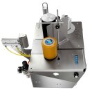 Manuelle Tischetikettiermaschine für selbstklebende  Etiketten, ausgestattet  mit einer pneumatischen Anpressrolle für die Anbringung des Vorderetikettes auf zylindrischen Behälter.