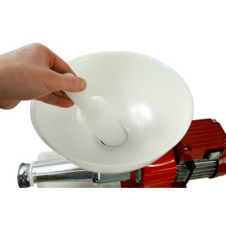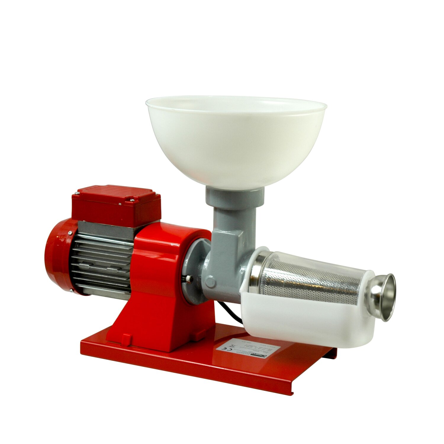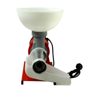 Elektrische Tomaten-/Beerenmühle für intensiven Gebrauch mit Edelstahlsieb (1,5 mm). Trichter und Auslaufbehälter aus Kunststoff. Mit leistungsfähigem Elektromotor 400 Watt mit thermischer Sicherung. Kapazität: bis 100 kg/Stunde