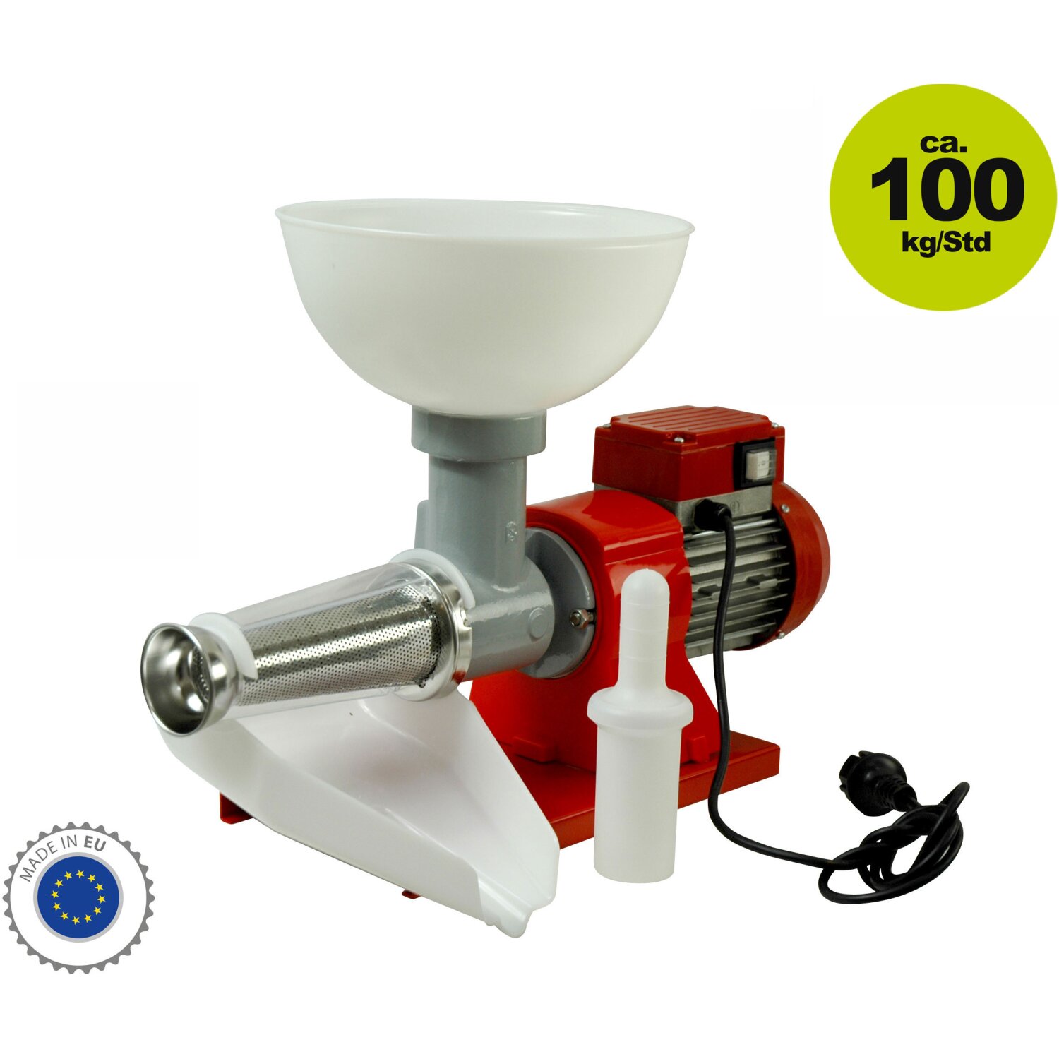Elektrische Tomaten-/Beerenmühle für intensiven Gebrauch mit Edelstahlsieb (1,5 mm). Trichter und Auslaufbehälter aus Kunststoff. Mit leistungsfähigem Elektromotor 400 Watt mit thermischer Sicherung. Kapazität: bis 100 kg/Stunde