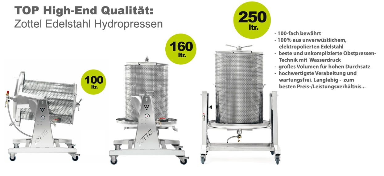 SPEIDEL (einer der Pioniere der Hydropressen-Technik), ZOTTEL (hochwertige, elektropolierte Edelstahl-Pressen bis 250 Liter für Profis) und FISCHER-LAHR (breites Sortiment von 6 bis 90 l, viele Detailverbesserungen wie vorgeschalteter Druckminderer die aktuell kein anderer Anbieter aufweist, gutes Preis-Leistungs-Verhältnis im Direktvertrieb).