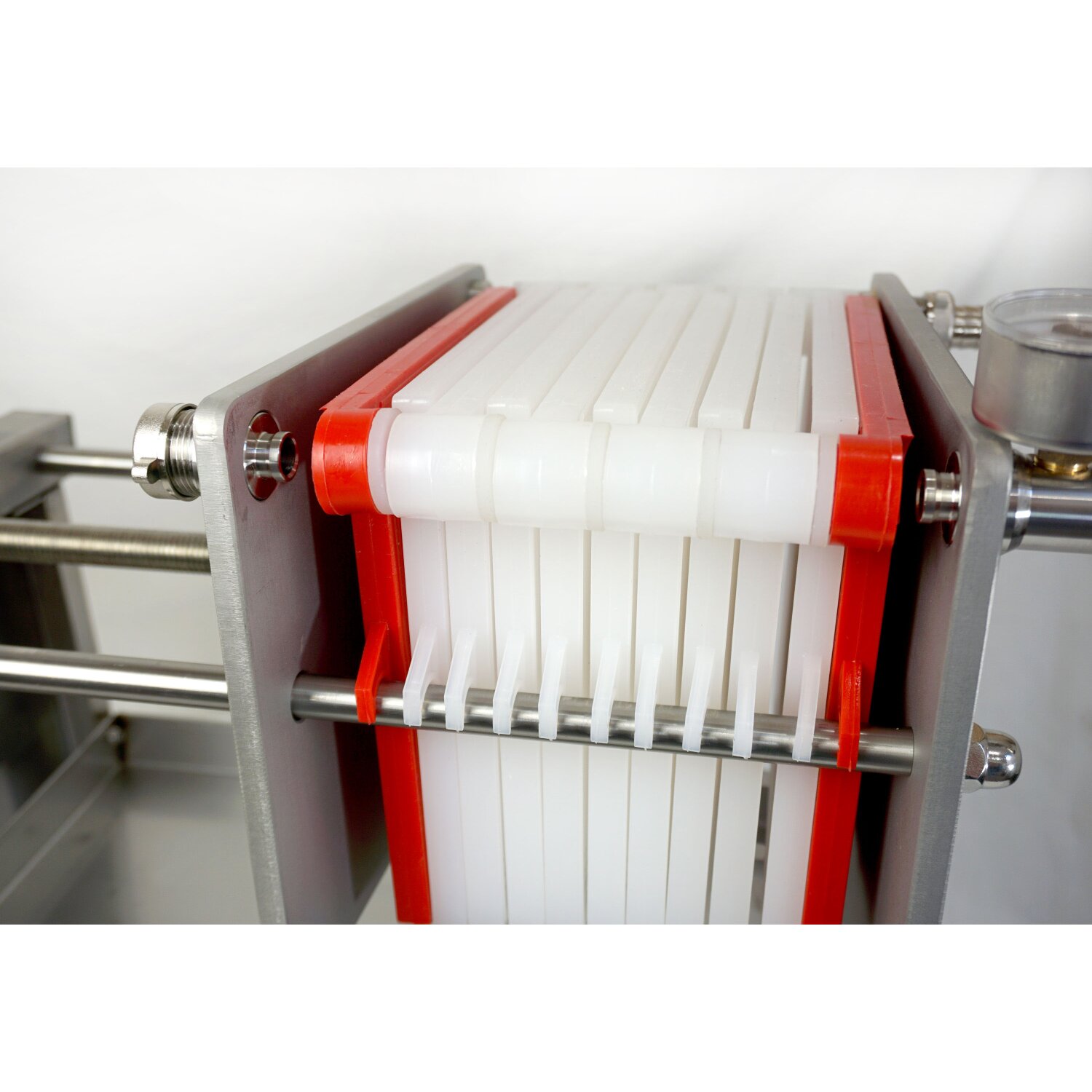 Das Filtergestell aus Edelstahl ist ausgelegt für maximal 20 Filterschichten und 21 Filterplatten.